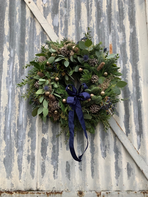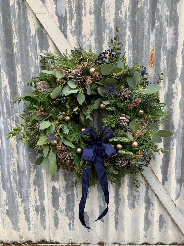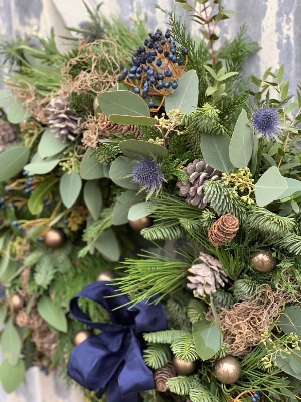 Our Jack Frost Wreath embodies the cool enchantment of winter’s palette. Deep blue viburnum berries and sculptural thistles are woven through lush seasonal foliage and rustic pinecones, capturing the quiet beauty of a frosted woodland morning. Finished with an elegant navy ribbon bow, this handcrafted wreath adds a refined, wintry touch to your holiday décor — crisp, captivating, and effortlessly stylish.