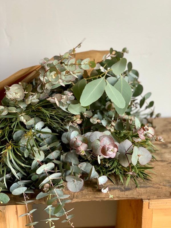 A bunch of aromatic eucalyptus foliages, in a selection of varieties such as cinerea, parvifolia, nicoli and gunnii. Choose how much you'd like (depending on your vase size!) and this comes simply wrapped in kraft papers and twines ready for you to plonk into a vase of fresh cold water.
