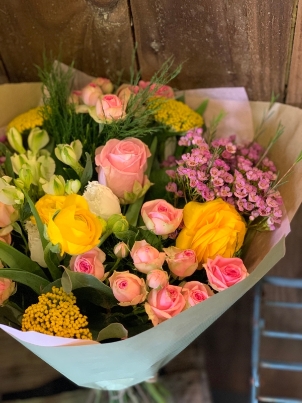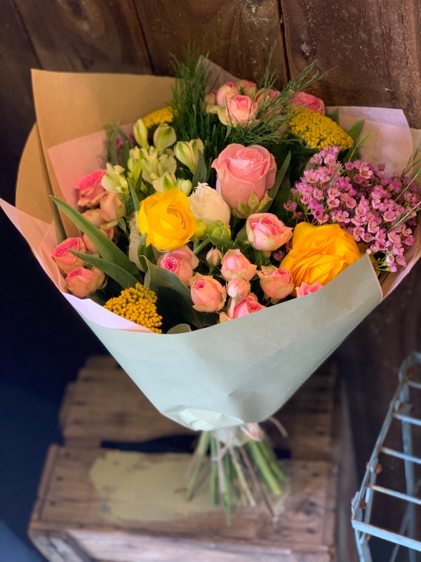 A hand tied of pinks, yellows, and whites complete with spring blooms.